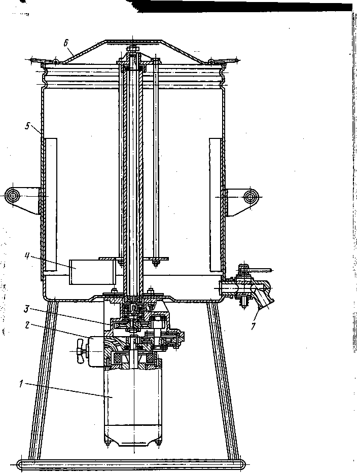 Рис.2.6. Смеситель СО-11: электродвигатель, 2 - трехполюсный выключатель 3 - тор, 4 - лопасти, 5 - бак, 6 - крышка, 7 - сливной кран
