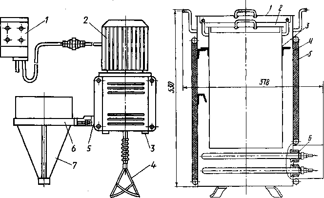 Электроклееварка С-409 (рис.11). В бак 4 вставляется сменный бак 3 вместимостью 16 л (ведро) для клея. В нижней части 0ака помещены электронагревательные элементы ЭТ-80 мощностью 3,6 кВт. Между баками заливают воду, включают электронагревательные элементы 6 и нагревают воду до 100 °С. Нагретая вода предохраняет клей при варке от пригорания. Сливают воду из бака через кран в нижней части. Время приготовления клея 1,5...2 ч.