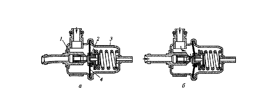 а — клапан закрыт; 6 — клапан открыт; 1 — корпус; 2 — клапан; 3 — крышка; 4 — диафрагма