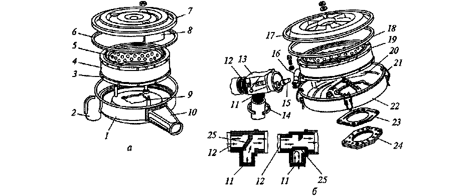 о — без терморегулятора; б — с терморегулятором; 1, 22 — корпуса; 2, 10, 11, 12, 16 — патрубки; 3, 19 — фильтрующие элементы; 4 — обкладка-предочиститель; 5— фильтр; 6, 18, 24— прокладки; 7, 17— крышки; 8— перегородка; 9 – ось; 13 — терморегулятор; 14 — шланг; 15 — термосиловой элемент; 20 — шпилька; 21 — защелка; 23 — пластина; 25 — заслонка