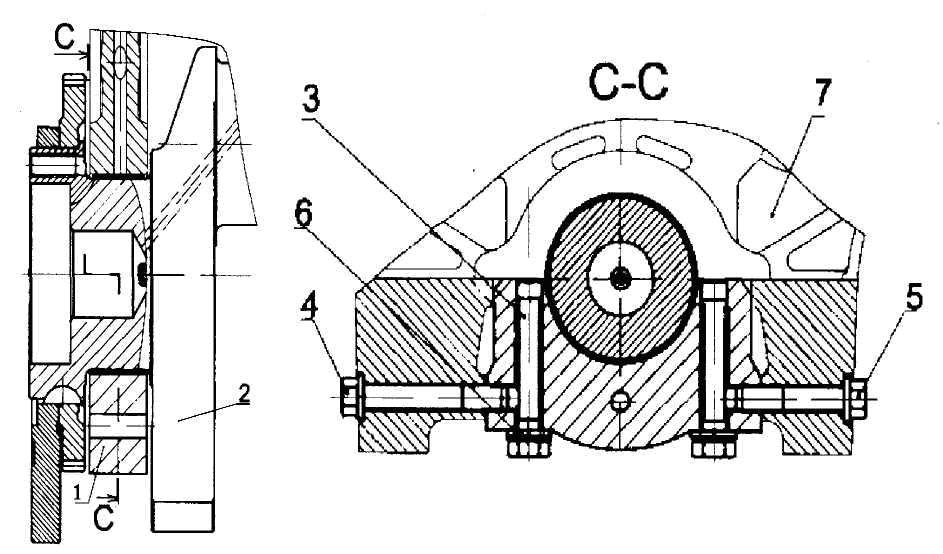 Крышки коренных подшипников (рис.4) изготовлены из высокопрочного чугуна марки ВЧ50. Крепление крышек осуществляется с помощью вертикальных и горизонтальных стяжных болтов 3, 4, 5, которые затягиваются по определенной схеме регламентированным моментом.