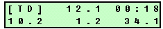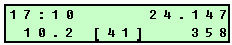 4. В середине нижней строки, в квадратных скобках, выводится остаток топлива в баке, вычисленный на основании данных датчика расхода топлива. Формат [ЛЛ] (точность 1л).