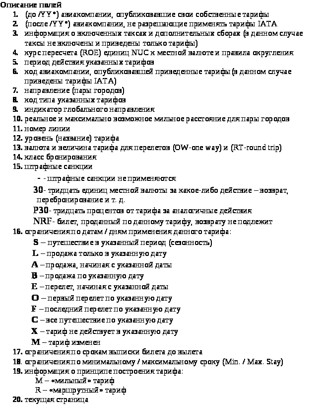 Все названные виды тарифов по условиям применения подразделяются на типы: нормальные (Normal Fares), специальные (Special of Promotional Fares) и льготные (Discounted Fares).