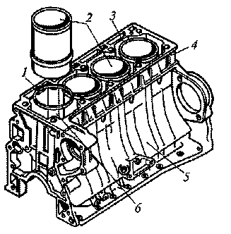 1 – кольцо; 2 – гильза; 3 – полость; 4 – блок; 5 – картер; 6 – гнездо