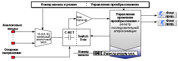 При периодическом опросе датчика следующее преобразование производится автоматически по окончании предыдущего. Времена выборки и преобразования устанавливаются в регистре управления АЦП. После окончания преобразования регистр результата содержит 10-разрядный результат, и номер канала, а в регистре управления устанавливается флаг прерывания. Если результат преобразования не считывается до начала следующего преобразования, устанавливается флаг ошибки, и вырабатывается прерывание. Для сохранения результата внеочередного преобразования по выбранному каналу во время непрерывного преобразования предусмотрен специальный регистр. Ниже на рисунке 3.7 приведена упрощенная блок-схема АЦП.