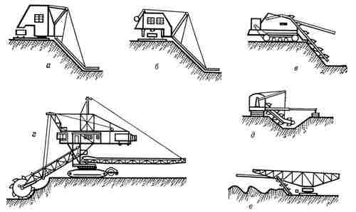 В зависимости от направления движения режущей кромки ковша по отношению к направлению движения машины различают экскаваторы продольного, поперечного и радиального копания.