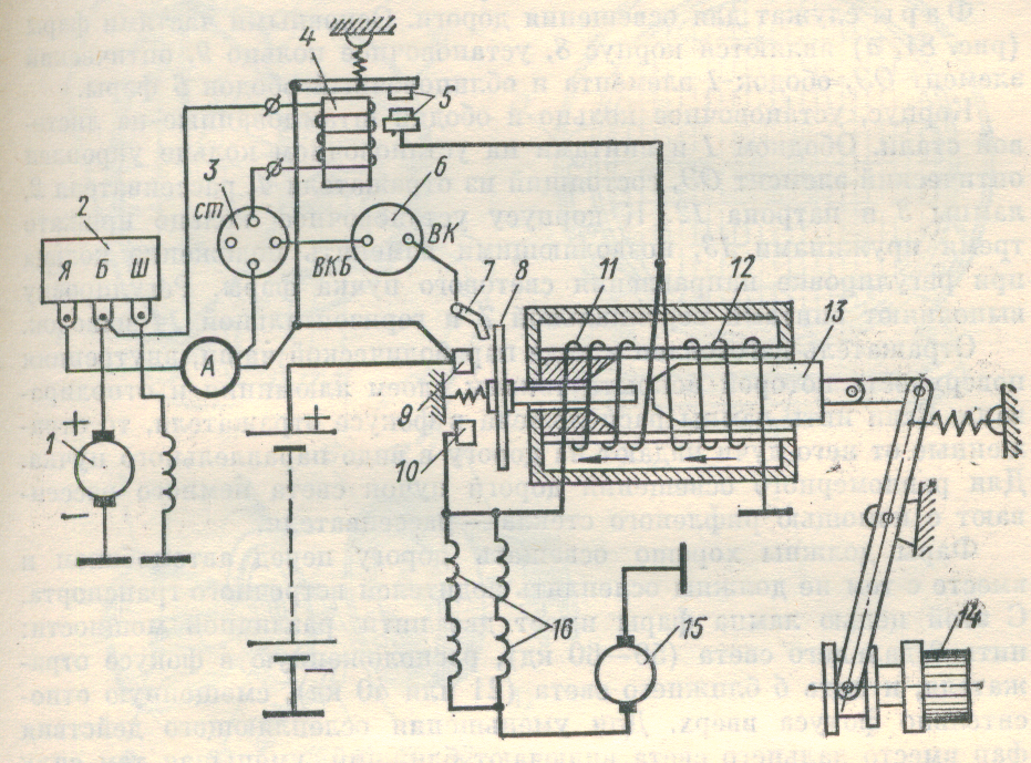 При пуске двигателя якорь 4 тягового реле, втягиваясь магнитным полем обмотки 3, перемещает рычаг 7 и связанную с ним муфту 14 привода. При этом шестерня 11 стартера входит в зацепление с венцом маховика двигателя