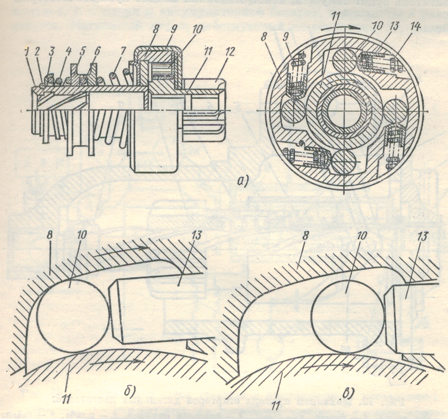 А – конструкция муфты, б – ролик заклинен, муфта передаёт момент, в – ролик вращается, муфта пробуксовывает ; 1 – втулка привода, 2,6 – замочные кольца, 3 – опорное кольцо, 4 – пружина, 5 – поводковая муфта, 7 – буферная пружина, 8 – обойма, 9 – кожух, 10 – ролик, 11 – ступица шестерни, 12 – шестерня, 13 – толкатель, 14 – пружина толкателя.