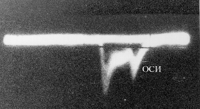 Мал.4. 3. Форми сигналів і просторовий розподіл інтенсивностей в кристалі дифенілу з пиреном [9]: (а) чисте ОСІ; (б) інжекційний імпульс; (в) ТОС. Ціна великого ділення 20 нс.