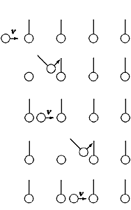 На рис.4.1 представлена механічна модель поширення фотона в речовині з врахуванням перевипроминювача. Кулька масою m0, рухаючись із швидкістю v, налітає на ланцюжок сферичних маятників, що мають таку ж масу m0. При зіткненні з першим маятником кулька, за законами пружних зіткнень, передає йому всю швидкість v. Той здійснює повний оберт (якщо v > 2(rg) 1/2, де r - довжина підвісу, g - прискорення вільного падіння) і після повторного зіткнення з кулькою повертає йому швидкість v.