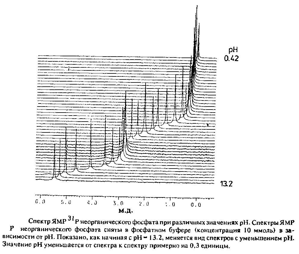 Неорганический фосфат принимает участие во многих ферментативных реакциях, поскольку он либо переносится на субстрат, либо расщепляется. Кроме того, неорганический фосфат принимает на себя функцию буфера. Для фосфатной группы существуют кроме двух различных протонированных форм в равновесии еще и следующие формы: Н3РО4, H>2>PO>4>», HPO>4>2», PO>4>3». При измерении спектров ЯМР 1P для различных значений рН мы всякий раз наблюдаем один сигнал, химический сдвиг которого изменяется в зависимости от концентрации ионов гидроксония. Такой вид спектра полностью соответствует случаю быстрого обмена.