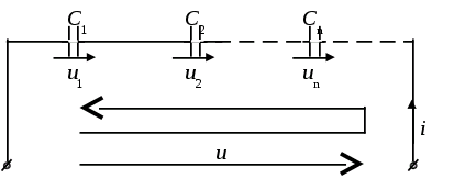 В случае последовательного соединения конденсаторов (рисунок 9) по второму закону Кирхгофа можно записать: