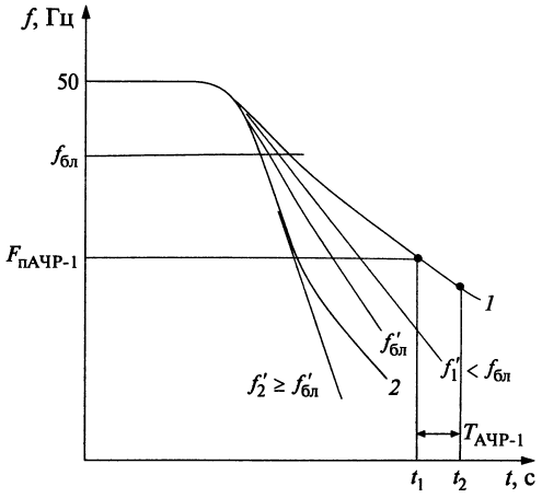 Линия 2 на этом же рисунке представляет такой процесс изменения контролируемой частоты, при котором ее значение до момента разгрузки t>3> не успевает вернуться к f>В АЧР-2>.