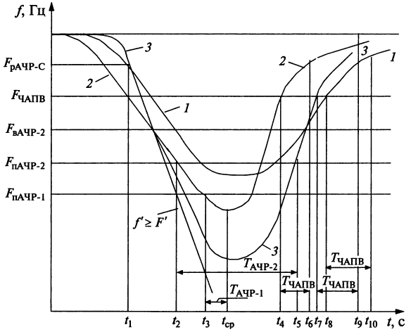 Для графика 3 эти условия выполняются в момент времени t>2>. При фактической скорости изменения частоты, превышающей F'>yст> пуск алгоритма произойдет при том же значении частоты f>p >>АЧР-С>, но ранее, в момент t>1>.