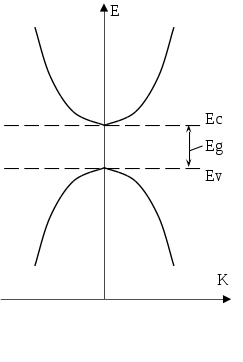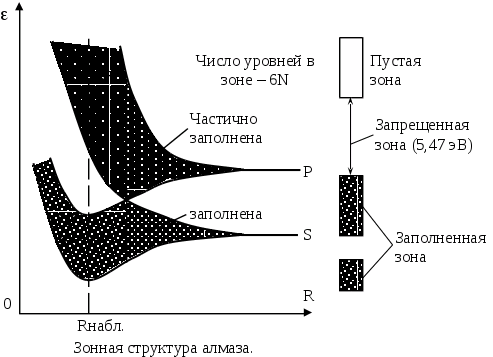 Волновые функции S и P – электронов образуют одну совершенно пустую гибридную SP – зону и одну заполненную гибридную SP – зону. Заполненная и пустая зоны разделены довольно значительным энергетическим интервалом или зоной запрещенных значений энергии. Для изоляторов типичное значение ширины запрещенной зоны ~ 5 эв и больше. Ширина запрещенной зоны для полупроводников (германия 0,67 эв, кремния 1,12 эв) находится в пределах 0,1 3 эв.