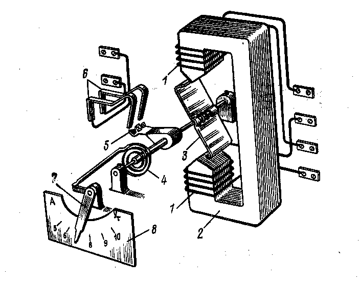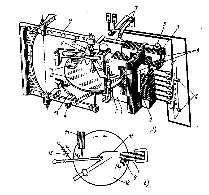 Рассмотрим принцип действия и конструкции различных типов реле, применяемых в схемах РЗ. На рис. 3 показана конструкция электромагнитного реле серии ЭТ-520 мгновенного срабатывания. Ток срабатывания реле регулируется натяжением спиральной пружины 4 с помощью рычага 7. Обмотка 1, расположенная на сердечнике 2, состоит из двух секций, что позволяет последовательным или параллельным включением секций изменять пределы регулирования тока срабатывания четырьмя ступенями. Якорь 3 поворачивается и контактный мостик 5 замыкает неподвижные контакты 6, чем обеспечивается подача отключающего импульса на выключатель. У ставка реле устанавливается на шкале 8.