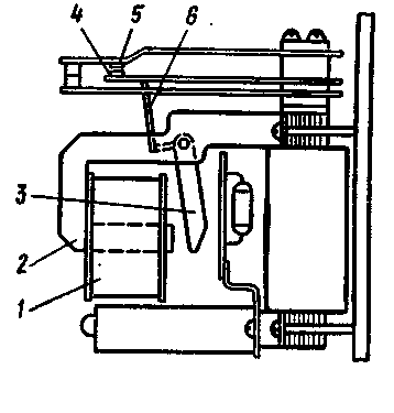 или размыкание цепей такой мощности, на которую контакты основного реле не рассчитаны, то они сначала замыкают цепь катушки промежуточного реле, которое своими контактами замыкает соответствующие цепи основного реле. При прохождении тока по катушке 1, превышающего ток нормального режима, срабатывает якорь 3 магнитной системы 2. С помощью рычага 6 замыкаются контакты 4 и 5.