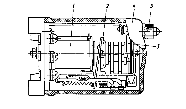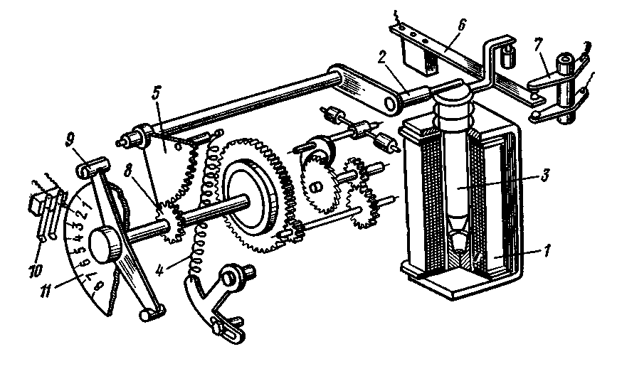 Реле времени имеют выдержки в диапазоне 0,1–20 с. Наибольшее распространение получили реле времени с часовыми механизмами. При подаче напряжения на обмотку 1 реле якорь 3 втягивается, палец 2 освобождается и под действием пружины 4 происходит поворот зубчатого сектора 5 по часовой стрелке, а шестерня 8 и подвижной контакт 9 поворачиваются против часовой стрелки, что приводит к замыканию контактов 10. Выдержка времени регулируется перемещением контактов 10 по шкале 11, отградуированной в секундах; контакты б и 7 мгновенного срабатывания без выдержки времени.