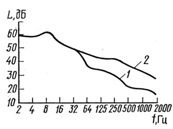 Можно с уверенностью сказать? что способов борьбы с инфразвуком не так уж и много. Общественные меры борьбы с шумом начали разрабатываться уже давно. Например, Юлий Цезарь почти 2000 лет назад в Риме запретил езду ночью на грохочущих колесницах. А 400 лет назад королева Англии Елизавета III запретила мужьям бить своих жен после 10 часов вечера, "чтобы их крики не беспокоили соседей". Многие другие запреты так же вводились в разных странах в разные исторические периоды. Сейчас уже в мировом масштабе принимаются меры борьбы с шумовым загрязнением среды: усовершенствуются двигатели и другие части машин, этот фактор учитывается при проектировании трасс и жилых районов, используются звукоизолирующие материалы и конструкции, экранирующие устройства, зеленые насаждения. Но следует помнить, что и каждый из нас должен быть активным участником этой борьбы с шумом. Должны приниматься меры по снижению интенсивности аэродинамических процессов - ограничение скоростей движения транспорта, снижение скоростей истечения жидкостей (авиационные и ракетные двигатели, двигатели внутреннего сгорания, системы сброса пара тепловых электростанций и т.д.). В технике, борьбу с инфразвуком в источнике возникновения необходимо вести в направлении изменения режима работы технологического оборудования - увеличения его быстроходности (например, увеличение числа рабочих ходов кузнечно-прессовых машин, чтобы основная частота следования силовых импульсов лежала за пределами инфразвукового диапазона). При выборе конструкций предпочтение должно отдаваться малогабаритным машинам большой жесткости, так как в конструкциях с плоскими поверхностями большой площади и малой жесткости создаются условия для генерации инфразвука. В качестве индивидуальных средств защиты рекомендуется применение наушников, вкладышей, защищающих ухо от неблагоприятного действия сопутствующего шума. К мерам профилактики организационного плана следует отнести соблюдение режима труда и отдыха, запрещение сверхурочных работ. При контакте с ультразвуком более 50% рабочего времени рекомендуются перерывы продолжительностью 15 мин через каждые 1,5 часа работы. Значительный эффект дает комплекс физиотерапевтических процедур - массаж, УТ-облучение, водные процедуры, витаминизация и др. Некоторые исследователи разделяют действие инфразвука на четыре градации – от слабой до ... смертельной. Классификация – вещь хорошая, но она выглядит довольно беспомощно, если неизвестно, с чем связано проявление каждой градации. Применение звукоизоляции инфразвука на практике представляет достаточно сложную инженерную задачу, так как требуются весьма мощные строительные конструкции с массой одного квадратного метра изоляции не менее 105-106 кг. На нижеследующем рисунке представлены спектры уровня инфразвука от оборудования цеха по производству асфальта, замеренные в квартирах первого этажа 4 - этажного панельного дома, имеющего двойные деревянные переплеты окон. Спектр 1 соответствует измерению инфразвука в квартире с открытыми окнами, спектр 2 - с закрытыми. Обращает на себя внимание полное отсутствие эффекта звукоизоляции в инфразвуковом диапазоне частот. Следует отметить, что существующие расчетные зависимости эффективности звукоизоляции неприменимы для инфразвука.