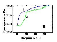 На рисунке 2 представлены результаты измерения поперечной проводимости сформированных структур. Кривые 1 измерены после имплантации водорода (до введения кислорода), кривые 2 - после проведения всех операций.