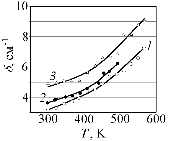 Рис.6. Температурная зависимость ширины контура >1> (A) колебания NO>3>- в кристалле NaNO>3> (1), а также в системах NaNO>3> - NaCH>3>COO (2) и NaNO>3> - Na>2>SO>4> (3).