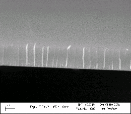 Как показали проведенные исследования, реализация описанной выше последовательности технологических операций (имплантация водорода или гелия, введение кислорода из плазмы, отжиг) при определенном выборе режимов позволяет создавать в кремнии системы нанотрубок, перпендикулярных поверхности пластины. На рисунке 3 представлены СЭМ-изображения поверхности и торца пластины кремния со сформированными в ней одномерными дефектами (нанотрубками).