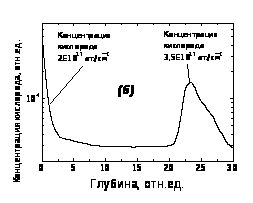 Рис.1. ВИМС-профили распределения кислорода в пластинах кремния со сформированным захороненным кислородсодержащим слоем: а - доза имплантации водорода 21016 см-2, б - доза имплантации водорода 41016 см-2