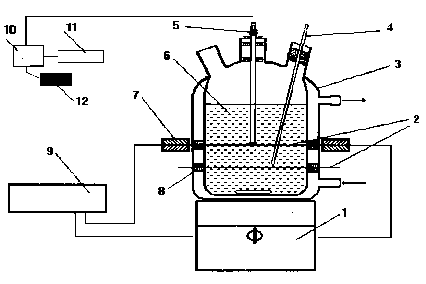 Рис. 1. Схема экспериментальной установки: 1 - электромагнитная мешалка; 2 - проволочный образец; 3 - термостатируемая реакционная ячейка; 4 - термометр; 5 - акустический волновод с пьезокерамическим кристаллом; 6 - реакционная среда; 7 - зажим тестера механических испытаний; 8 - пробка из кислотостойкой резины; 9 - вольтметр; 10 - осциллограф; 11 - генератор; 12 - усилитель.