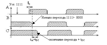 Тогда, через некоторое время t>з>, обусловленное инерционностью триггеров, счетчик восстановит свою работоспособность. Поэтому сигнал запуска счетчика С снимается с инверсного входа рециркуляционного генератора, что обеспечивает задержку запускающего перепада 1 – 0 относительно момента снятия сигнала установки А (момент начала «разблокирования» счетчика). Величина этой задержки t>з> зависит от емкости, подключенной к шине С (величина емкости должна быть не менее 40 пФ – в работе используется входная емкость осциллографа). При этом под воздействием перепада 1 – 0 на шине С счетчик начинает совершать переход в состояние 0000.