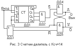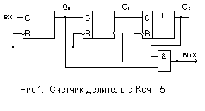 С помощью дополнительного логического элемента можно изменять К>сч> (деления) в пределах 2m-1<K>сч><2m, для чего входы ЛЭ подключаются к выходам определенных триггеров, а его выход – ко входам R принудительной установки триггеров в нулевое состояние, а иногда и ко входам S – установки в "1".