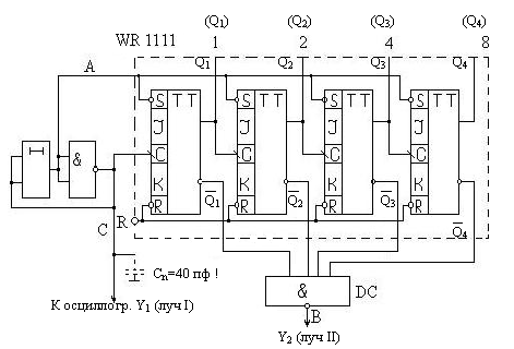 Регистрация времени осуществляется с помощью двухлучевого осциллографа. Последовательно отсоединяя сигналы от входов схемы дешифратора, определить зависимость времени переходов от числа разрядов счетчика.