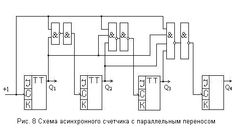 Счетчики с параллельным переносом состоят из синхронных триггеров. Счетные импульсы подаются одновременно на все тактовые входы, а каждый из триггеров цепочки служит по отношению к последующим только источником информационных сигналов. Срабатывание триггеров параллельного счетчика происходит синхронно, и задержка переключения всего счетчика равна задержке переключения для одного триггера. Счетчики с параллельным переносом широко применяются в быстродействующих устройствах.