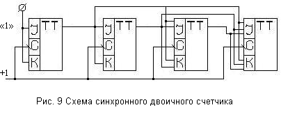 В суммирующем счетчике каждый входной импульс увеличивает число, записанное в счетчик, на 1. Как следует из таблицы, перенос информации из одного разряда в другой, более высокий, имеет место, когда происходит смена состояния с 1 на 0.