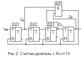 Рассмотренные счетчики имеют коэффициент счета К>сч>= 5 и К>сч>= 13 т.е. выходной сигнал счетчика будет после 5-го или 13-го импульса (выходным сигналом является перепад с "1" на "0") – переход с "1" на "0" сигнала Q>2>.