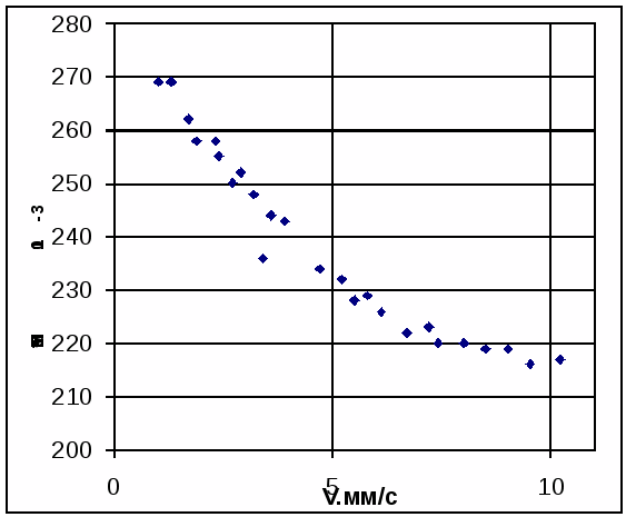 Рис.3. Зависимость толщины приповерхностного слоя от скорости течения препарата.
