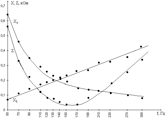 Частотные характеристики Xc(f), XL(f), ZK(f).