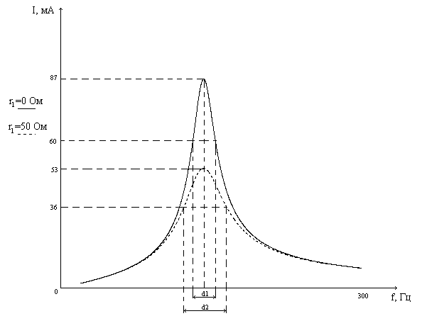 Характеристическое сопротивление контура определяется по точке пересечения частотных характеристик на частоте 142 Гц. В точке пересечения реактивные сопротивления катушки индуктивности и ёмкости равны между собой и составляют примерно 210-220 Ом. Теоретическое расчётное значение характеристического сопротивления и экспериментальное значение совпадают с достаточной точностью.