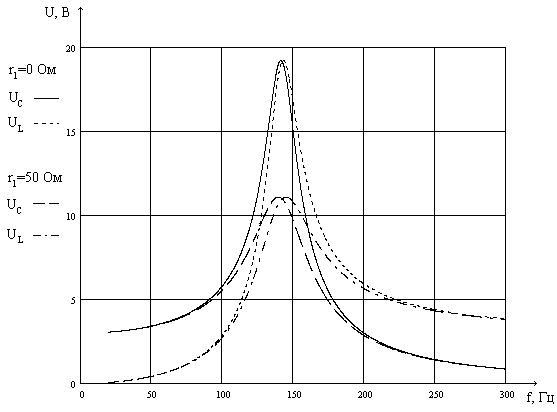 Рис. 3. Резонансные кривые напряжений на ёмкости и индуктивности