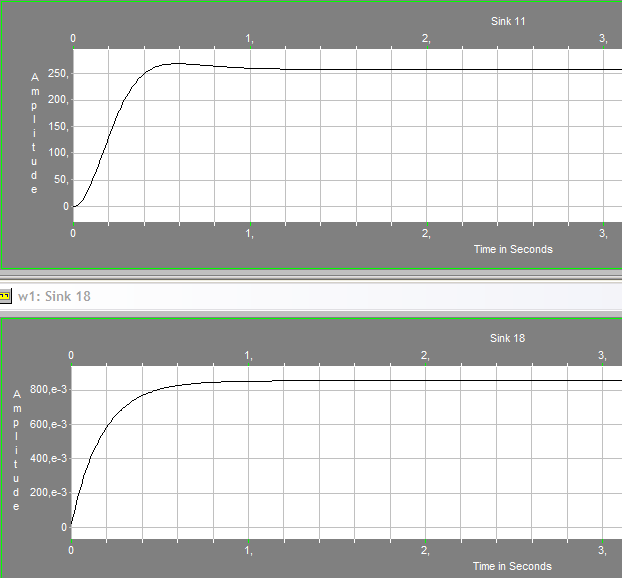 Все полученные данные подставляем в структурную схему (рис. 2) и проведем ее моделирование с помощью программного пакета Matlab. Величины U>я>= U>в>= U>с> подаются на входы схемы ступенчатым воздействием. На выходе снимаем значение скорости вращения двигателя >1>. Динамическая характеристика двигателя (график изменения скорости >1>(t) при номинальных параметрах и М>с>=0) изображена на рис. 3. График показывает выход скорости на установившееся значение при включении двигателя.