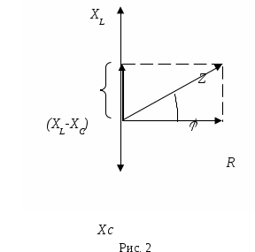 Если к концам этой цепи приложено переменное напряжение, изменяющееся по закону (1), то в ней возникнут вынужденные электрические колебания с частотой . Сила этого переменного тока будет определяться по формуле (2), причем для нахождения амплитуды и фазы тока необходимо учесть влияние всех элементов цепи: R, L, С. Лучше всего это можно сделать с помощью векторной диаграммы (треугольника сопротивлений) (рис. 2). Из рисунка видно, что полное сопротивление цепи равно: