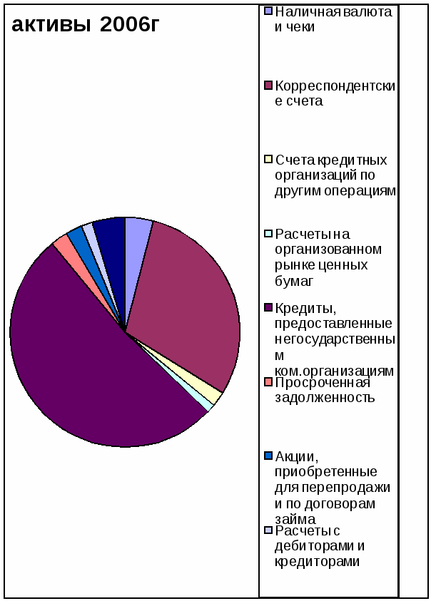 В 2006 году наибольший удельный вес в пассивах составили кредиты, предоставленные негосударственным коммерческим организациям (46,54%). Среди них основными являются кредиты, предоставленные негосударственным коммерческим организациям на срок от 1 года до 3 лет (18,88%), и на срок от 8 до 30 дней (15,44%). В 2007 году удельный вес этого показателя немного снизился (46,22%) (кредиты, предоставленные негосударственным коммерческим организациям на срок от 1 года до 3 лет - 13,66%, и на срок от 8 до 30 дней - 15,37%), однако абсолютная величина увеличилась на 138825 тысяч рублей. Далее по величине удельного веса располагаются корреспондентские счета. В 2006 году он составил 26,84%, но в 2007 году удельный вес, а также абсолютная величина сократились почти в 2 раза и составил 14,85%. . Это резкое снижение свидетельствует о недостаточно активной кредитной политике. Изменения произошли в статье «Наличная валюта и чеки». В 2006 году удельный вес этого показателя составлял 3,56%, а к 2007 году он увеличился в 1,5 раза и стал составлять 6,17 %.