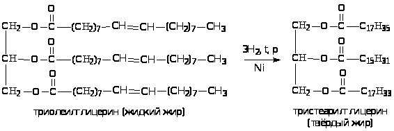 Реакции присоединения: гидрирование или гидрогенизация - получение твердых жиров из жидких. Характерна для жидких жиров, содержащих кратные связи.