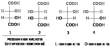 Для идентификации оптических изомеров гидроксилслдержащих веществ применяют D-L-номенклатуру. Оптические изомеры винной кислоты представлены на рисунке.
