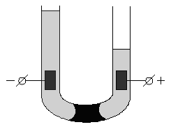 Если поместить золь в постоянное электрическое поле, то, как и в растворах электролитов, заряженные частицы будут двигаться к противоположно заряженным электродам: коллоидная частица с адсорбированными на ней противоионами – в одну сторону, противоионы диффузного слоя – в другую. Сила, с которой электрическое поле действует на частицы и, следовательно, скорость движения частиц, очевидно, будет пропорциональна ζ-потенциалу. Движение частиц дисперсной фазы в электрическом поле называется электрофорезом. Явление электрофореза можно наблюдать, поместив в U-образную трубку какой-либо окрашенный золь, поверх которого налит не смешивающийся с золем бесцветный электролит. Если опустить в электролит электроды и наложить разность потенциалов, то граница окрашенного золя в одном из колен трубки будет подниматься, в другом – опускаться (рис. 4.13). Если поместить в U-образную трубку пористую перегородку (например, мелкий кварцевый песок) и заполнить её водой, то при наложении разности потенциалов в одном колене будет наблюдаться подъем уровня жидкости, в другом – его опускание (рис. 4.14). Движение дисперсной среды в электрическом поле относительно неподвижной дисперсной фазы (в рассмотренном случае – относительно поверхности пористых тел) называется электроосмосом. Явления электрофореза и электроосмоса получили общее название электрокинетических явлений.