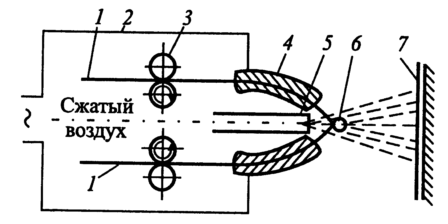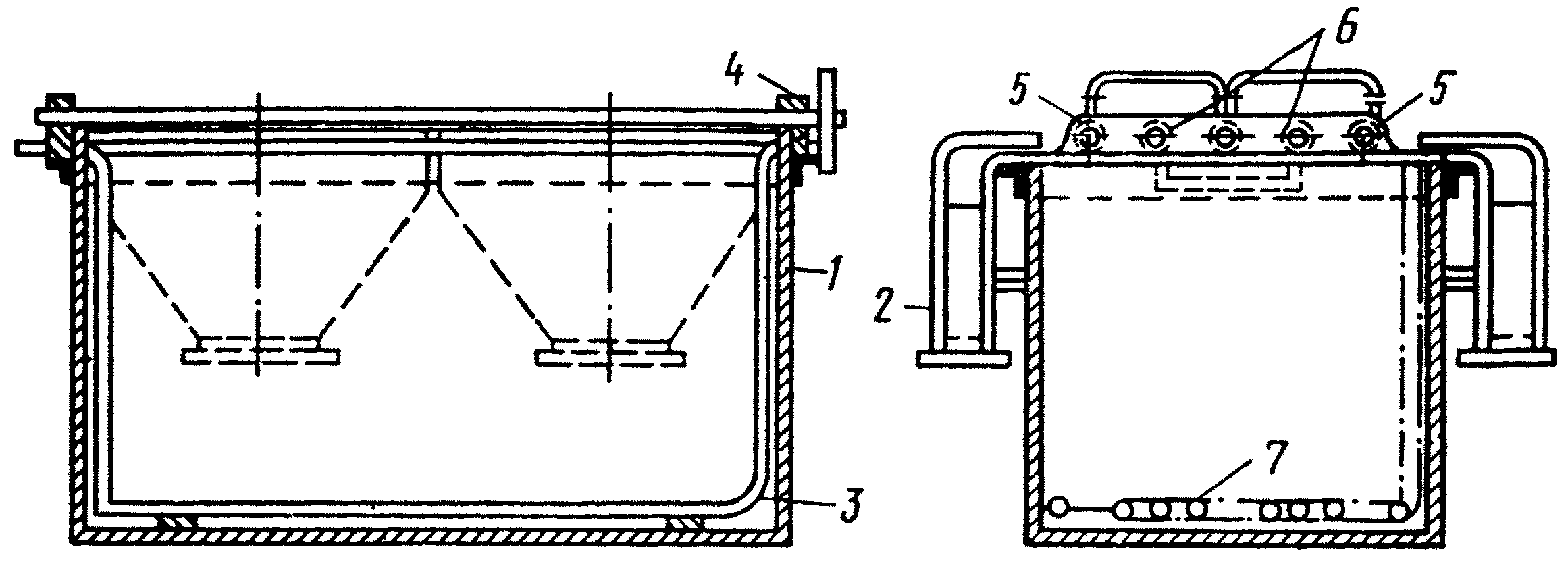 1 – корпус; 2 – вентиляционный кожух; 3 – змеевик для обогрева; 4 – изоляторы; 5 – анодные штанги; 6 – катодные штанги; 7 – барботер для перемешивания сжатым воздухом