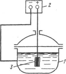 Рисунок - Схема катодной защиты плавильного котла: 1 — котел; 2 — источник тока; 3 —анод