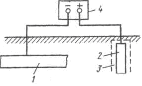 Схема катодной защиты представлена на рис. 51. Отрицательный полюс внешнего источника тока 4 присоединен к защищаемой металлической конструкции 1, а положительный полюс – к вспомогательному электроду 2, работающему как анод. В процессе защиты анод активно разрушается и подлежит периодическому восстановлению.
