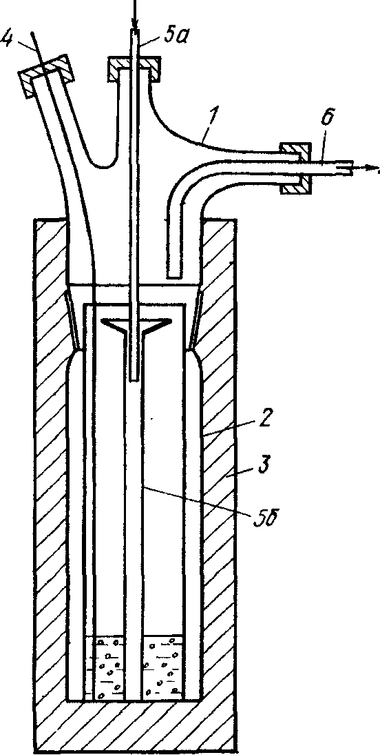 Гомогенный раствор, в состав которого входит родиевый комплекс, и высококипящие остатки от дистилляции, нагревают в реакторе, через который непрерывно проходит поток газа. На схеме применены следующие обозначения: 1 — верхняя часть стеклянного реактора; 2 —- нижняя часть стеклянного реактора; 3 — нагреватель; 4 — термопара; 5а — металлический капилляр со стеклянной входной трубкой; 56 — стеклянный капилляр; 6 — трубка для выхода продуктов. Все компоненты кубового остатка и продукты, образующиеся в результате пиролиза, выносятся из реактора током газа, а получающийся металл остается в реакционной камере.