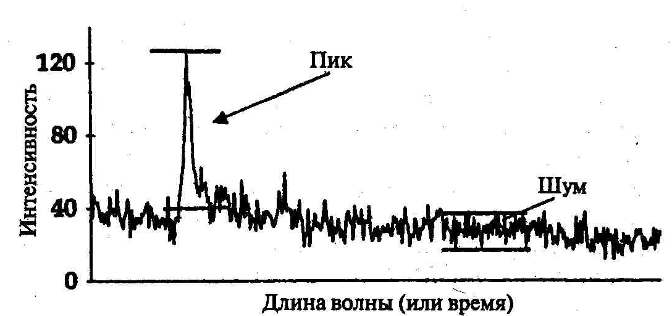 Одна из важнейших задач обработки сигналов состоит в том, чтобы отличить полезный сигнал от шума, подавить шум и таким образом извлечь из исходных данных «чистый> сигнал, увеличив количество полезной информации. При графическом представлении полезный сигнал, соответствующий индивидуальному веществу, обычно имеет форму пика, реже ступени.