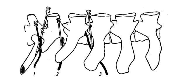 3 – подвздошно-пахового; пунктиром показано положение иглы